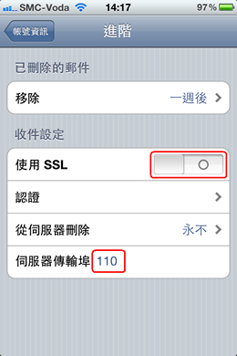 10. 开启<<使用SSL>>,并在<<服务器传输埠>>输入995。